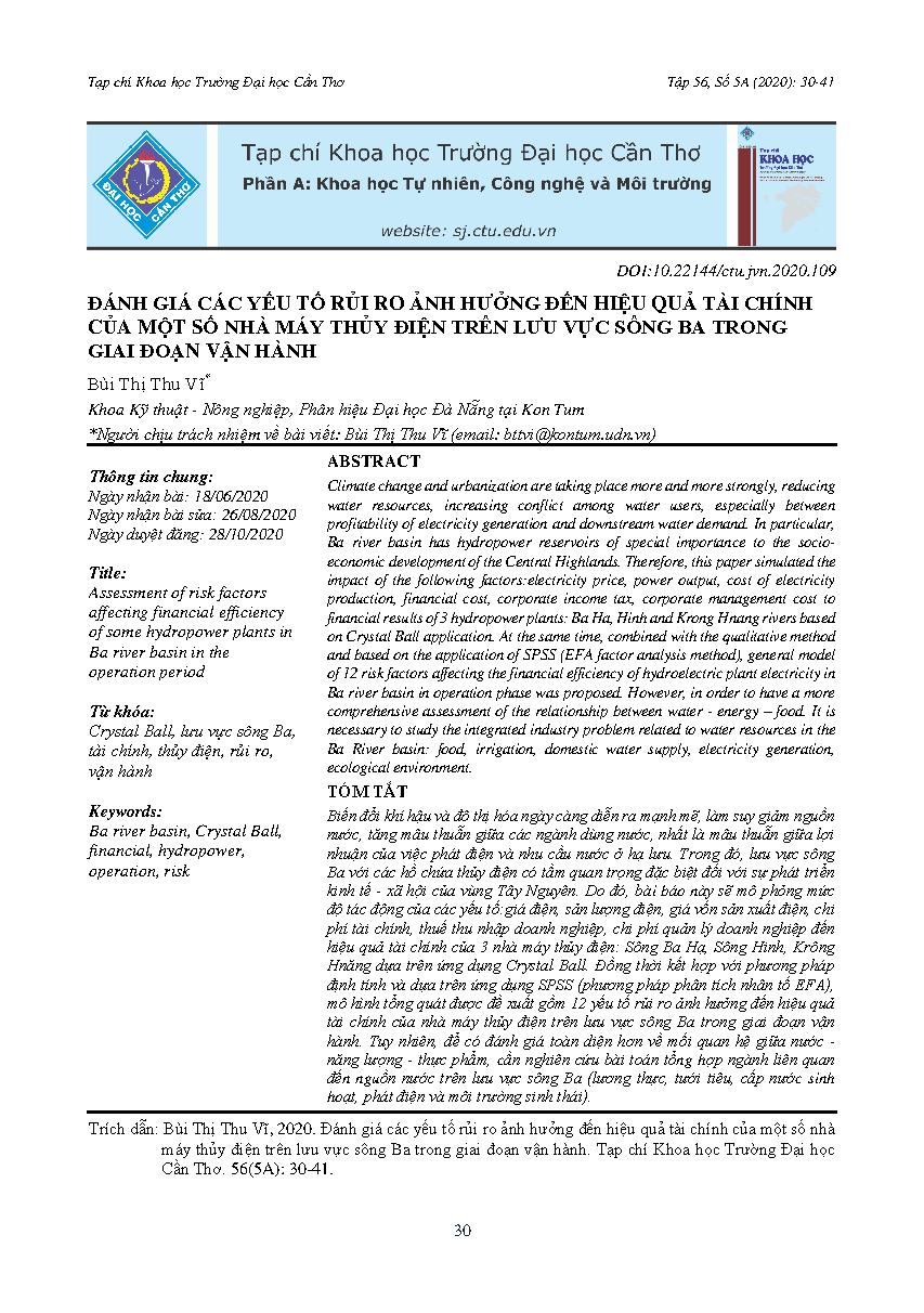 Đánh giá các yếu tố rủi ro ảnh hưởng đến hiệu quả tài chính của một số nhà máy thủy điện trên lưu vực sông Ba trong giai đoạn vận hành = Assessment of risk factors affecting financial efficiency of some hydropower plants in Ba river basin in the operation period
