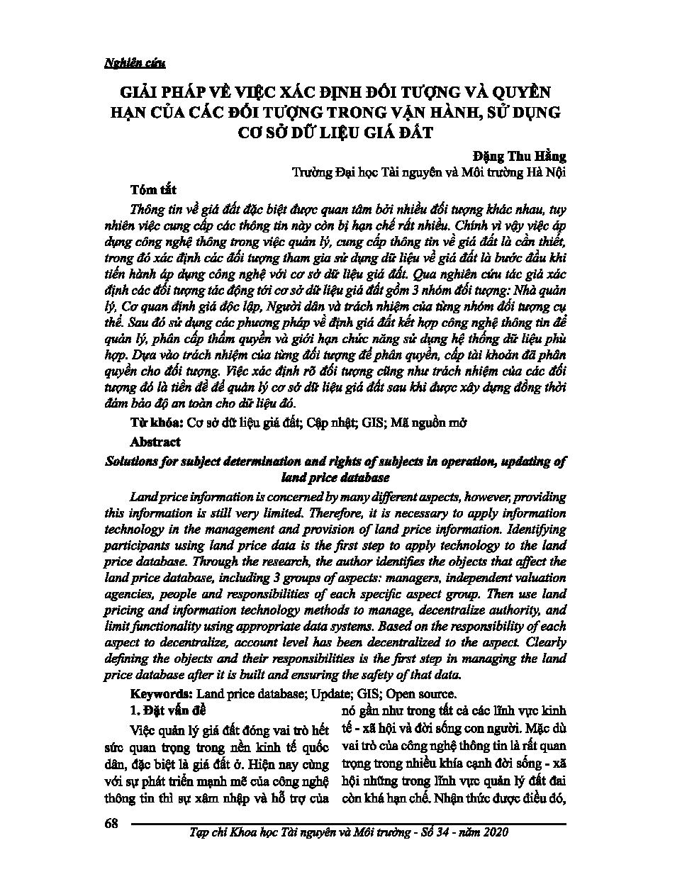 Giải pháp về việc xác định đối tượng và quyền hạn của các đối tượng trọng vận hành, sử dụng cơ sở dữ liệu giá đất = Solutions for subject determination and rights of subjects in operation, updating of land price database