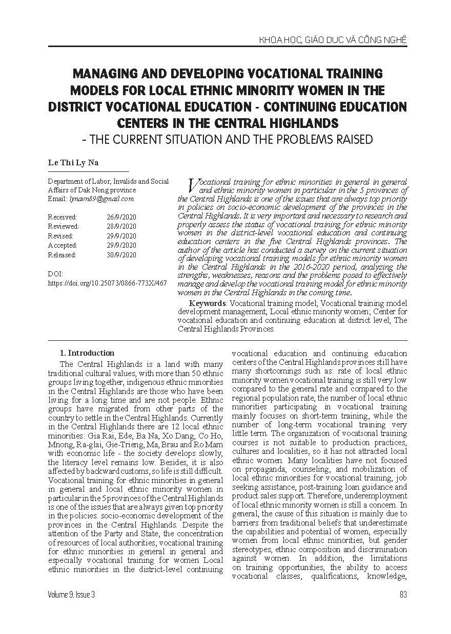 MANAGING AND DEVELOPING VOCATIONAL TRAINING MODELS FOR LOCAL ETHNIC MINORITY WOMEN IN THE DISTRICT VOCATIONAL EDUCATION - CONTINUING EDUCATION CENTERS IN THE CENTRAL HIGHLANDS - THE CURRENT SITUATION AND THE PROBLEMS RAISED = QUẢN LÝ PHÁT TRIỂN MÔ HÌNH ĐÀO TẠO NGHỀ CHO PHỤ NỮ CÁC DÂN TỘC THIỂU SỐ TẠI CHỖ Ở CÁC TRUNG TÂM GIÁO DỤC NGHỀ NGHIỆP - GIÁO DỤC THƯỜNG XUYÊN CẤP HUYỆN KHU VỰC TÂY NGUYÊN - THỰC TRẠNG VÀ NHỮNG VẤN ĐỀ ĐẶT RA