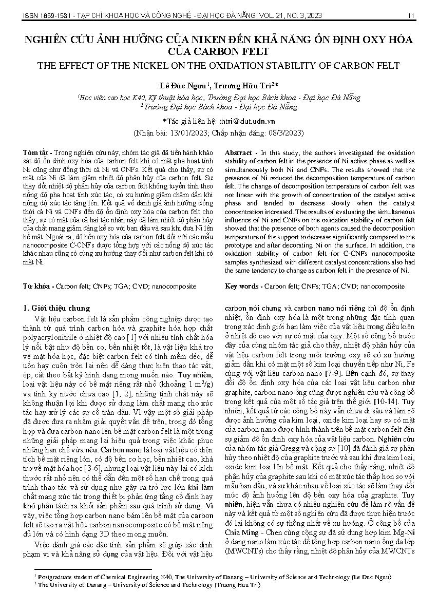 Nghiên cứu ảnh hưởng của niken đến khả năng ổn định oxy hóa của carbon felt = The effect of the nickel on the oxidation stability of carbon felt