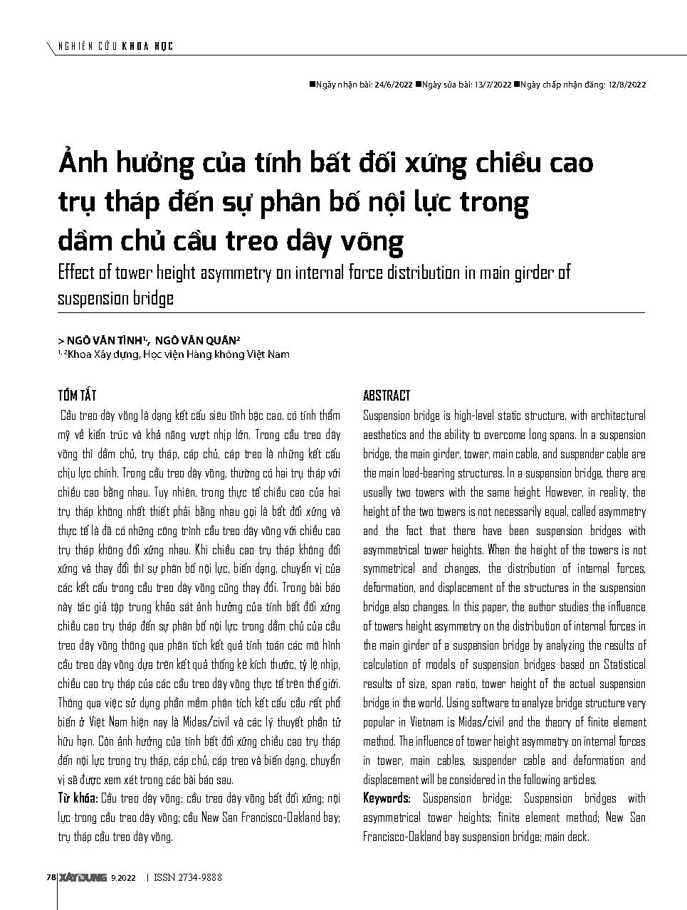 Ảnh hưởng của tính bất đối xứng chiều cao trụ tháp đến sự phân bố nội lực trong dầm chủ cầu treo dây võng = Effect of tower height asymmetry on internal force distribution in main girder of suspension bridge