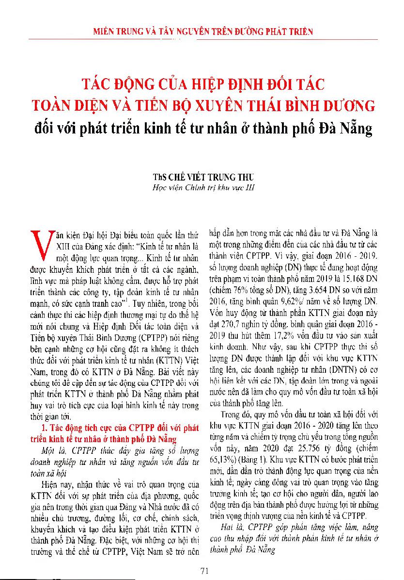 Tác động của hiệp định đối tác toàn diện và tiến bộ xuyên Thái Bình Dương đối với phát triển kinh tế tư nhân ở thành phố Đà Nẵng