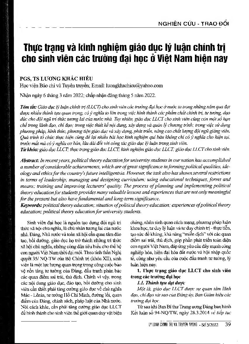 Thực trạng và kinh nghiệm giáo dục lý luận chính trị cho sinh viên các trường Đại học ở Việt Nam hiện nay = Current situation and experiences of political theory education for Vietnamese university students