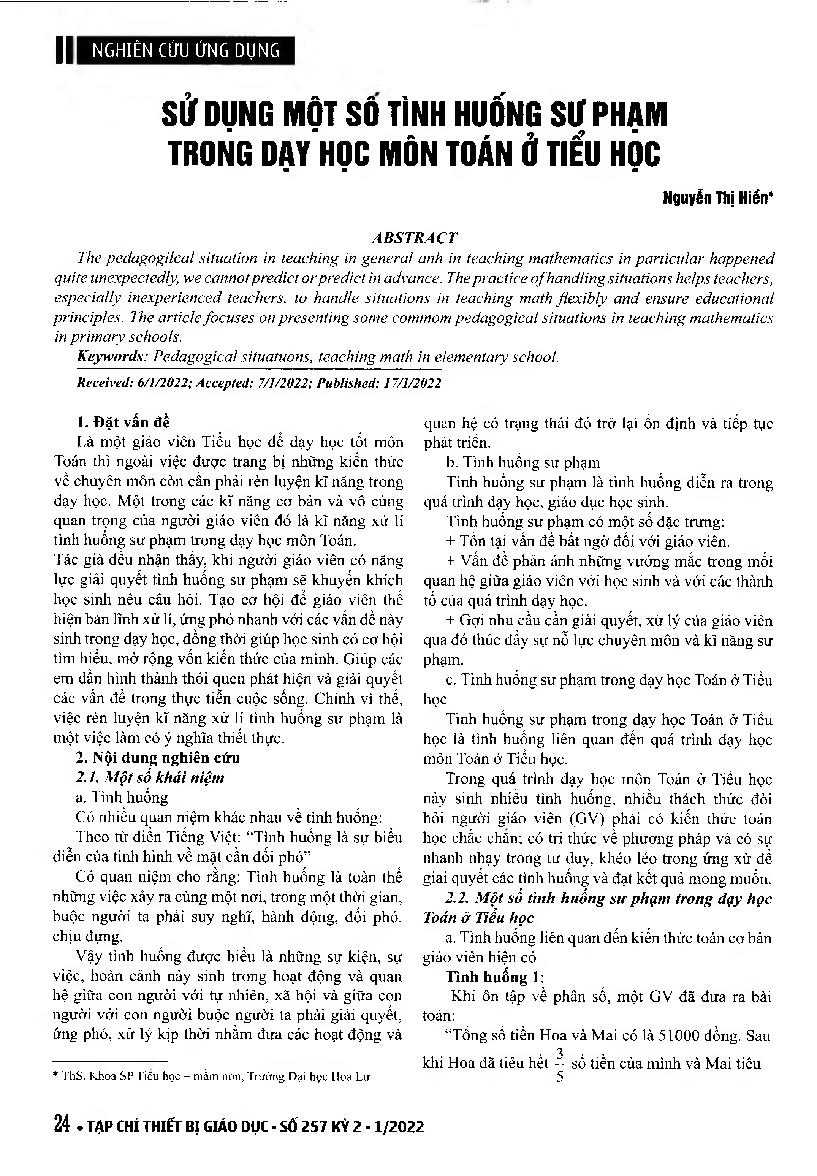 Sử dụng một số tình huống sư phạm trong dạy học môn Toán ở tiểu học = Using some pedagogical situations in teaching math In primary school