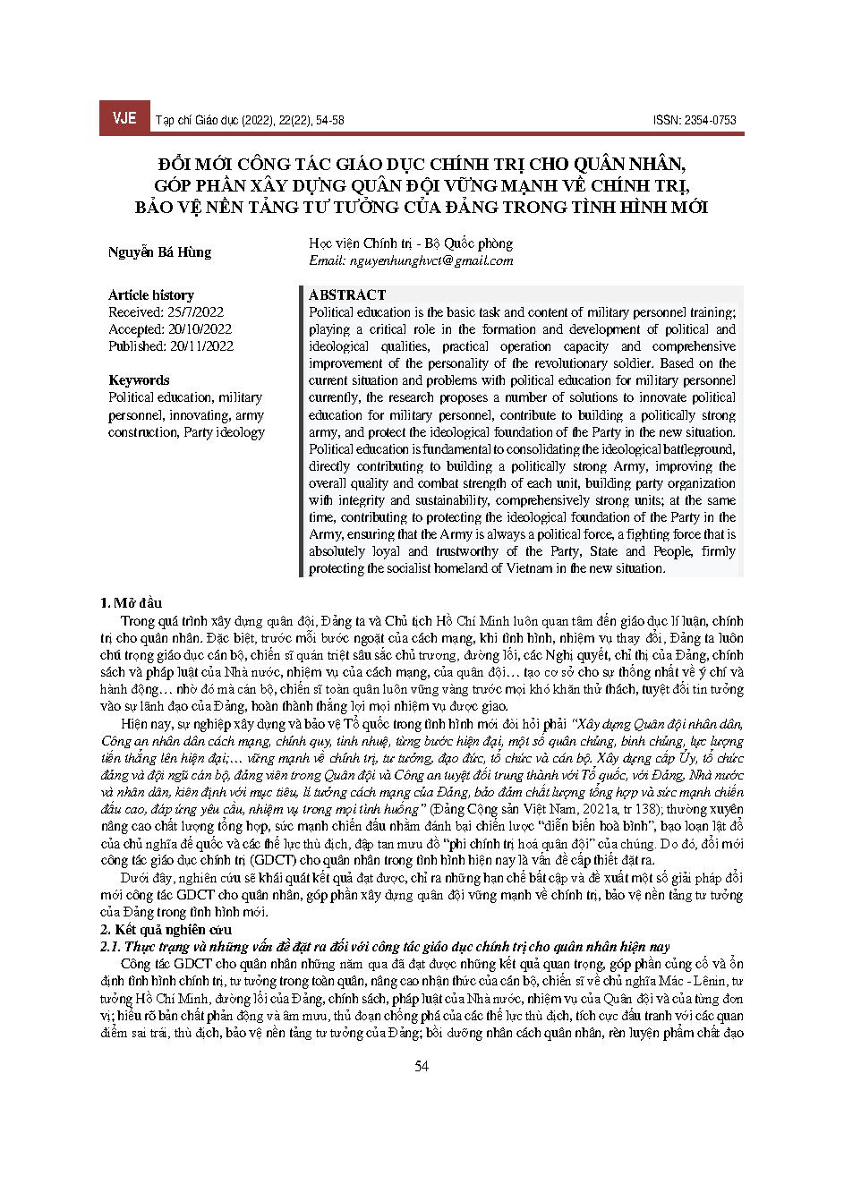 Đổi mới công tác giáo dục chính trị cho quân nhân, góp phần xây dựng quân đội vững mạnh về chính trị, bảo vệ nền tảng tư tưởng của đảng trong tình hình mới = Renovate political education for soldiers, contribute to building a strong political army, and pr