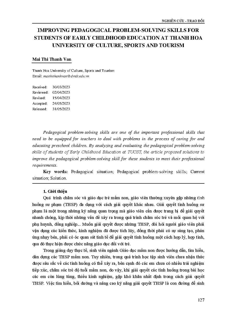 Nâng cao kỹ năng giải quyết tình huống sư phạm cho sinh viên ngành giáo dục mầm non trường Đại học Văn hóa, Thể thao và Du lịch Thanh Hóa = Improving pedagogical problem-solving skills for students of early childhood education at Thanh Hoa University of C