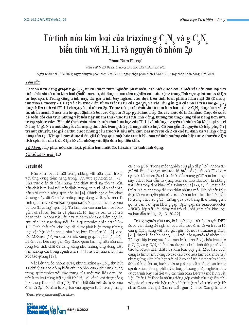 Từ tính nửa kim loại của triazine g-C4 N3 và g-C3 N4 biến tính với H, Li và nguyên tố nhóm 2p = Half-metallic magnetism in triazines g-C4N3 and g-C3N4 tailored with H, Li, and 2p elements