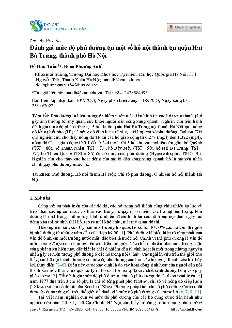 Đánh giá mức độ phú dưỡng tại một số hồ nội thành tại quận Hai Bà Trưng, thành phố Hà Nội = Assessment of eutrophication status of some inner lakes in Hai Ba Trung District, Hanoi City
