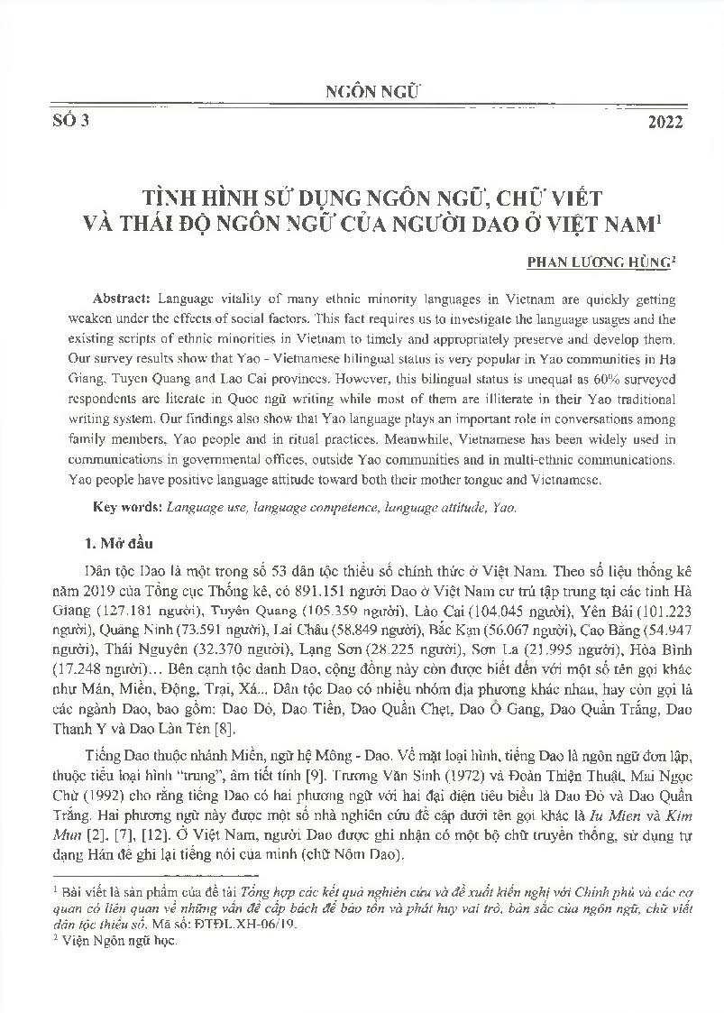 Tình hình sử dụng ngôn ngữ, chữ viết và thái độ ngôn ngữ của người Dao ở Việt Nam = Language use and language attitudes of Yao people in Vietnam