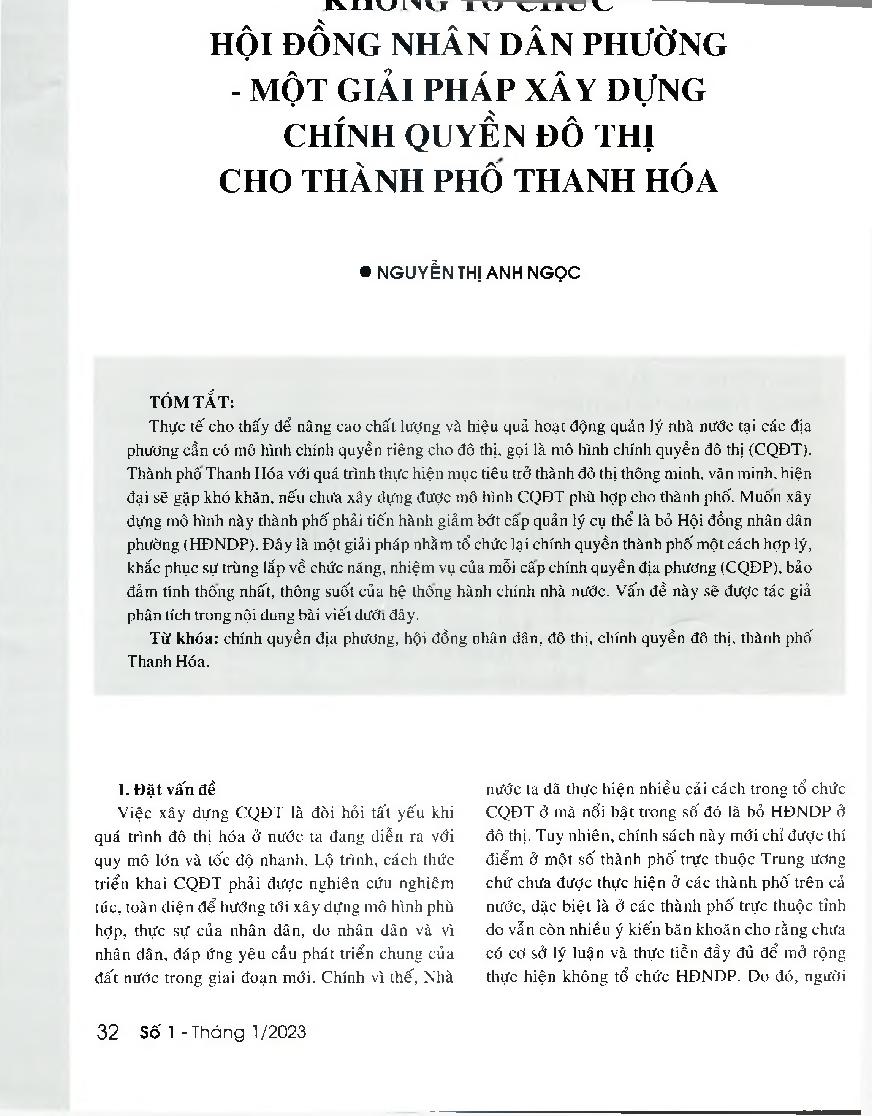 Không tổ chức Hội đồng nhân dân phường - Một giải pháp xây dựng chính quyền đô thị cho thành phố Thanh Hóa = Removing the People's Council at ward level - A solution for the urban governance model development of Thanh Hoa city