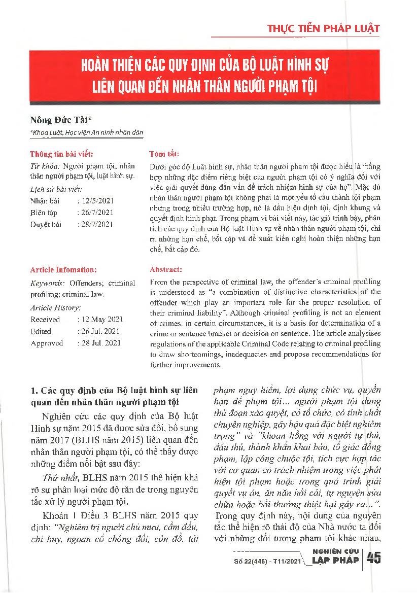 Hoàn thiện các quy định của bộ luật hình sự liên quan đến nhân thân người phạm tội = Completing the provisions of the penal code related to the offender's identity