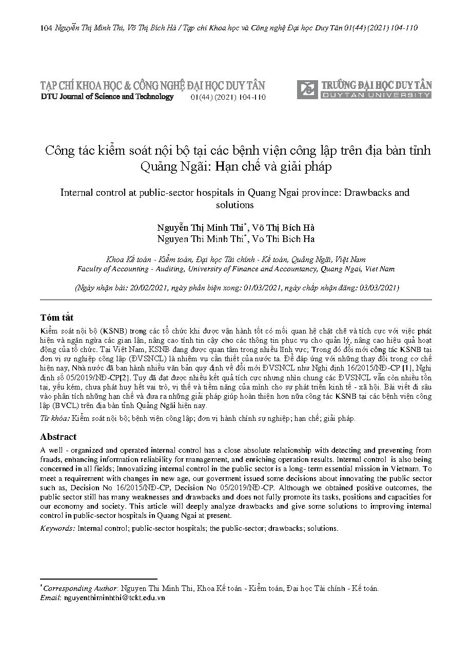 Công tác kiểm soát nội bộ taị các bệnh viện công lập trên địa bàn tỉnh Quảng Ngãi: Hạn chế và giải pháp = Internal control at public-sector hospitals in Quang Ngai province: Drawbacks and solutions