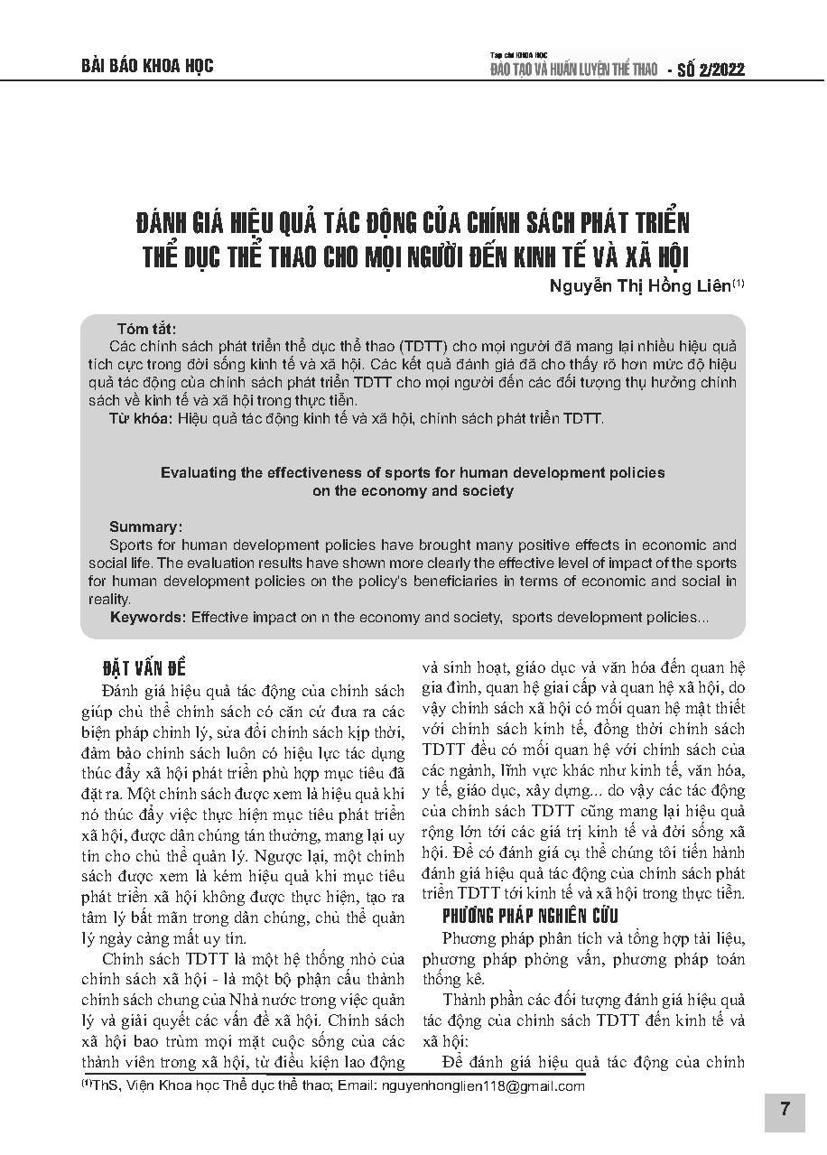Đánh giá hiệu quả tác động của chính sách phát triển thể dục thể thao cho mọi người đến kinh tế - xã hội = Evaluating the effectiveness of sports for human development policies on the economy and society