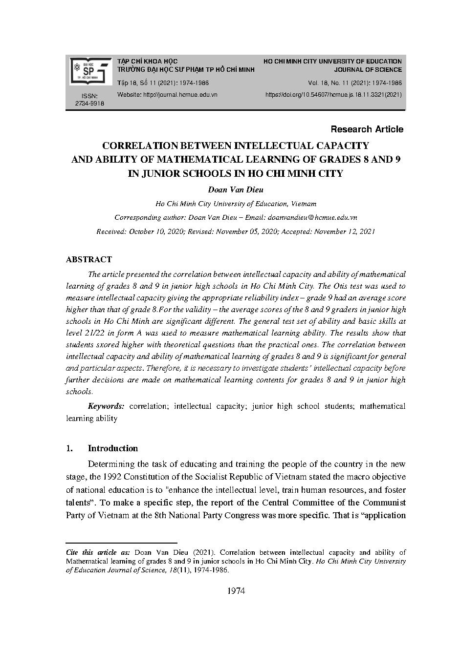 Hệ số tương quan giữa năng lực trí tuệ và khả năng học toán của học sinh lớp 8 và lớp 9 các trường trung học cơ sở ở thành phố Hồ Chí Minh = Correlation between intellectual capacity and ability of mathematical learning of grades 8 and 9 in junior schools in Ho Chi Minh city