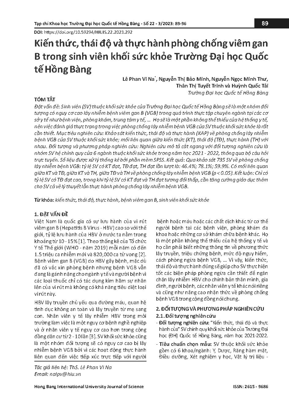 Kiến thức, thái độ và thực hành phòng chống viêm gan B trong sinh viên khối sức khỏe Trường Đại học Quốc tế Hồng Bàng