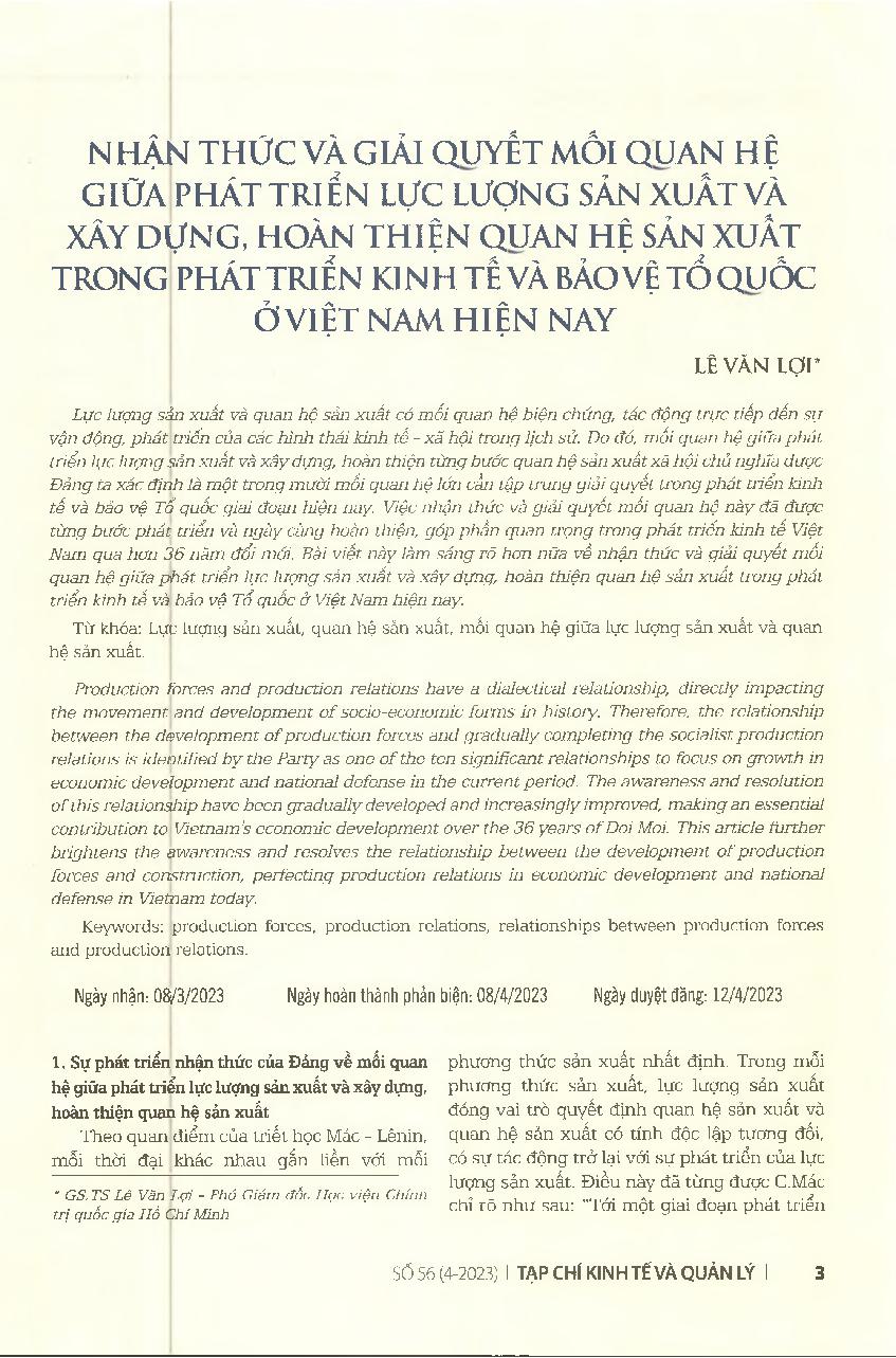 Nhận thức và giải quyết mối quan hệ giữa phát triển lực lượng sản xuất và xây dựng, hoàn thiện quan hệ sản xuất trong phát triển kinh tế và bảo vệ tổ quốc ở Việt Nam hiện nay