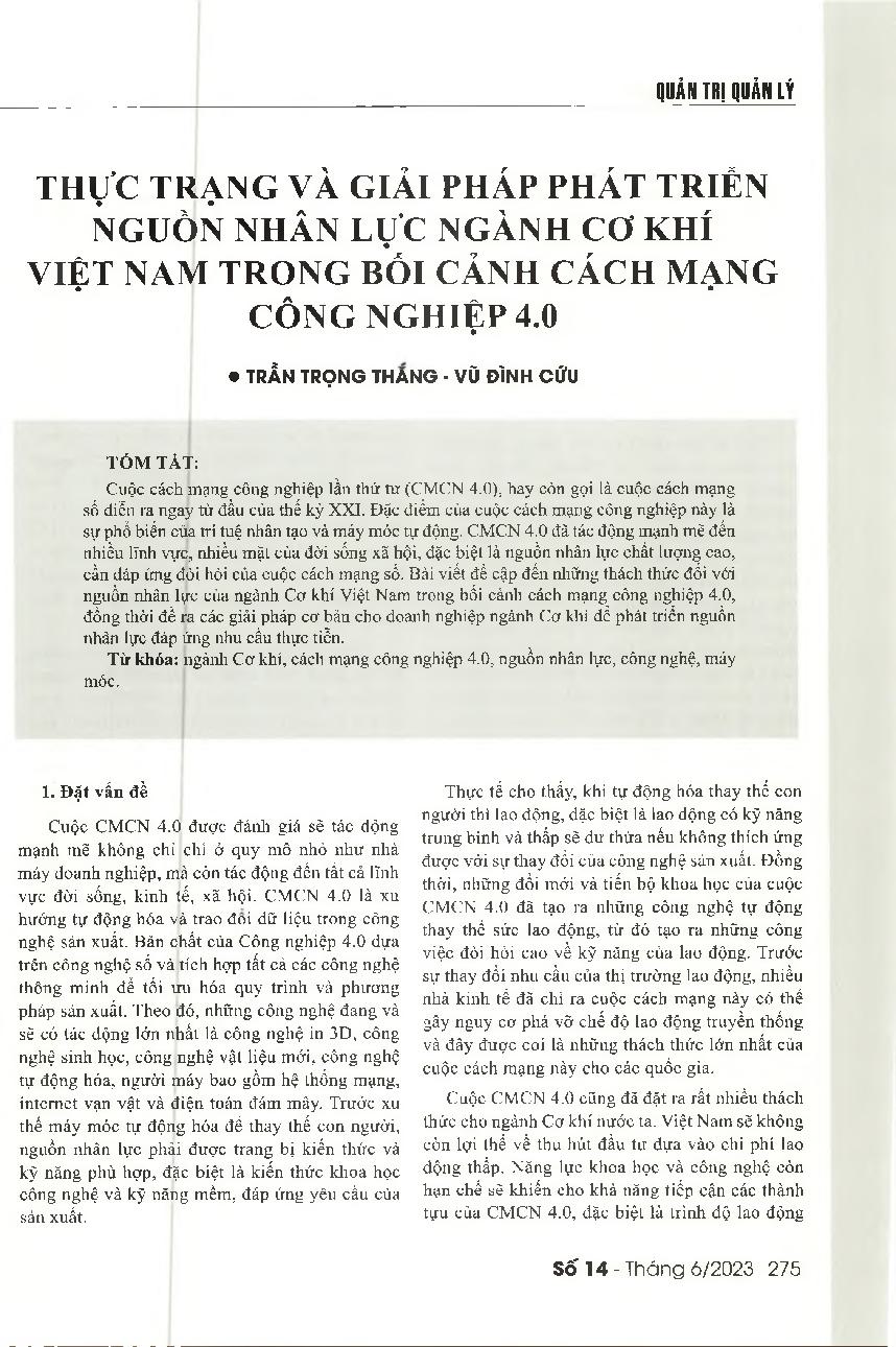 Thực trạng nguồn nhân lực ngành cơ khí Việt Nam trong bối cảnh cách mạng công nghiệp 4.0