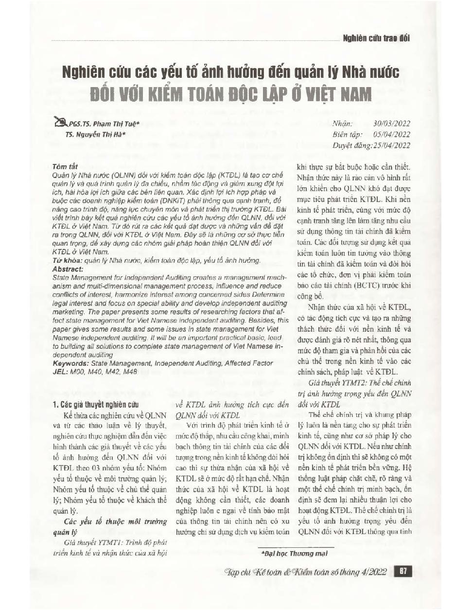 Nghiên cứu các yếu tố ảnh hưởng đến quản lý Nhà nước đối với kiểm toán độc lập ở Việt Nam = Researching in some factors affected to management of Viet Namese independent auditing