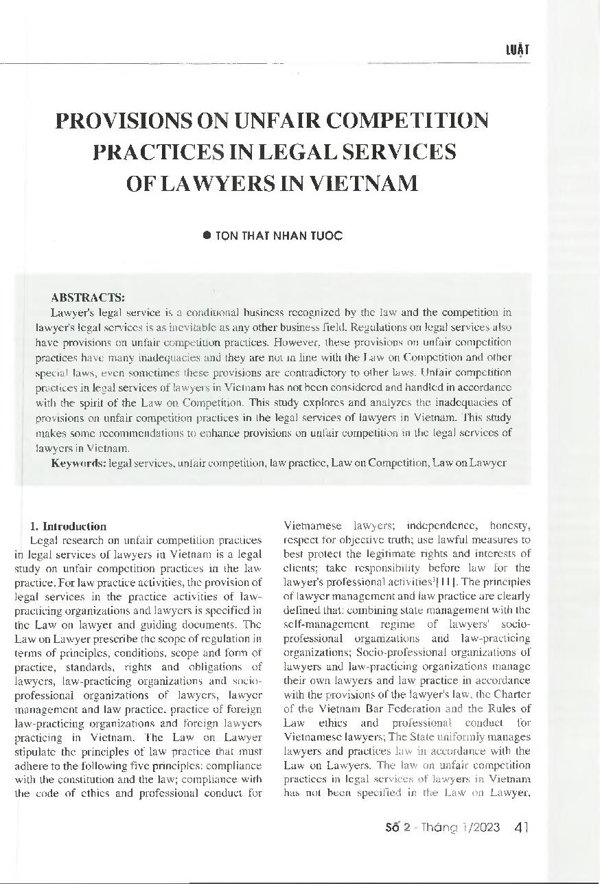 Pháp luật về hành vi cạnh tranh không lành mạnh trong dịch vụ pháp lý của luật sư ở Việt Nam = Provisions on unfair competition practices in legal services of lawyers in Vietnam