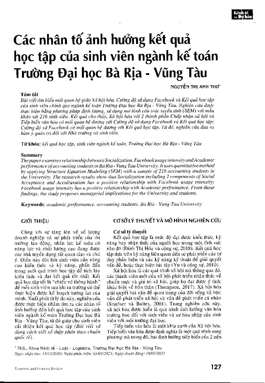 Các nhân tố ảnh hưởng kết quả học tập của sinh viên ngành kế toán Trường Đại học Bà Rịa - Vũng Tàu = Determinants of academic performance of accounting students in Ba Ria - Vung Tau University