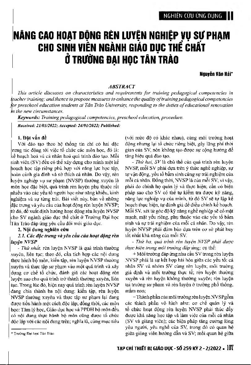 Nâng cao hoạt động rèn luyện nghiệp vụ sư phạm cho sinh viên ngành giáo dục thể chất ở trường Đại học Tân Trào = Enhancing pedagogical training activities for students majoring in physical education at Tan Tuoi University