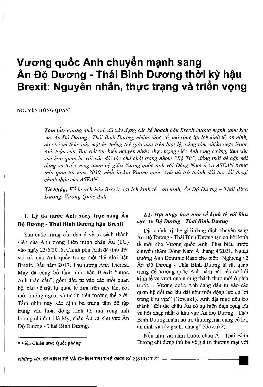 Vương quốc Anh chuyển mạnh sang Ấn Độ Dương - Thái Bình Dương thời kỳ hậu Brexit: Nguyên nhân, thực trạng và triển vọng = The UK&; 39;s strong shift to the Indo-Pacific in the post-Brexit period: Causes, status and Prospects