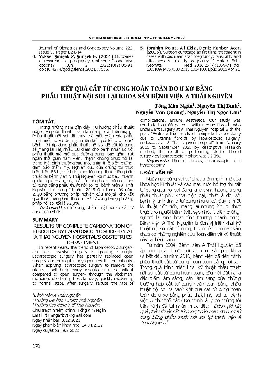 Kết quả cắt tử cung hoàn toàn do u xơ bằng phẫu thuật nội soi tại Khoa Sản Bệnh viện A Thái Nguyên = Results of complete carbonation of fibroids by laparoscopic surgery at A Thai Nguyen hospital&; 39;s obstetrics department