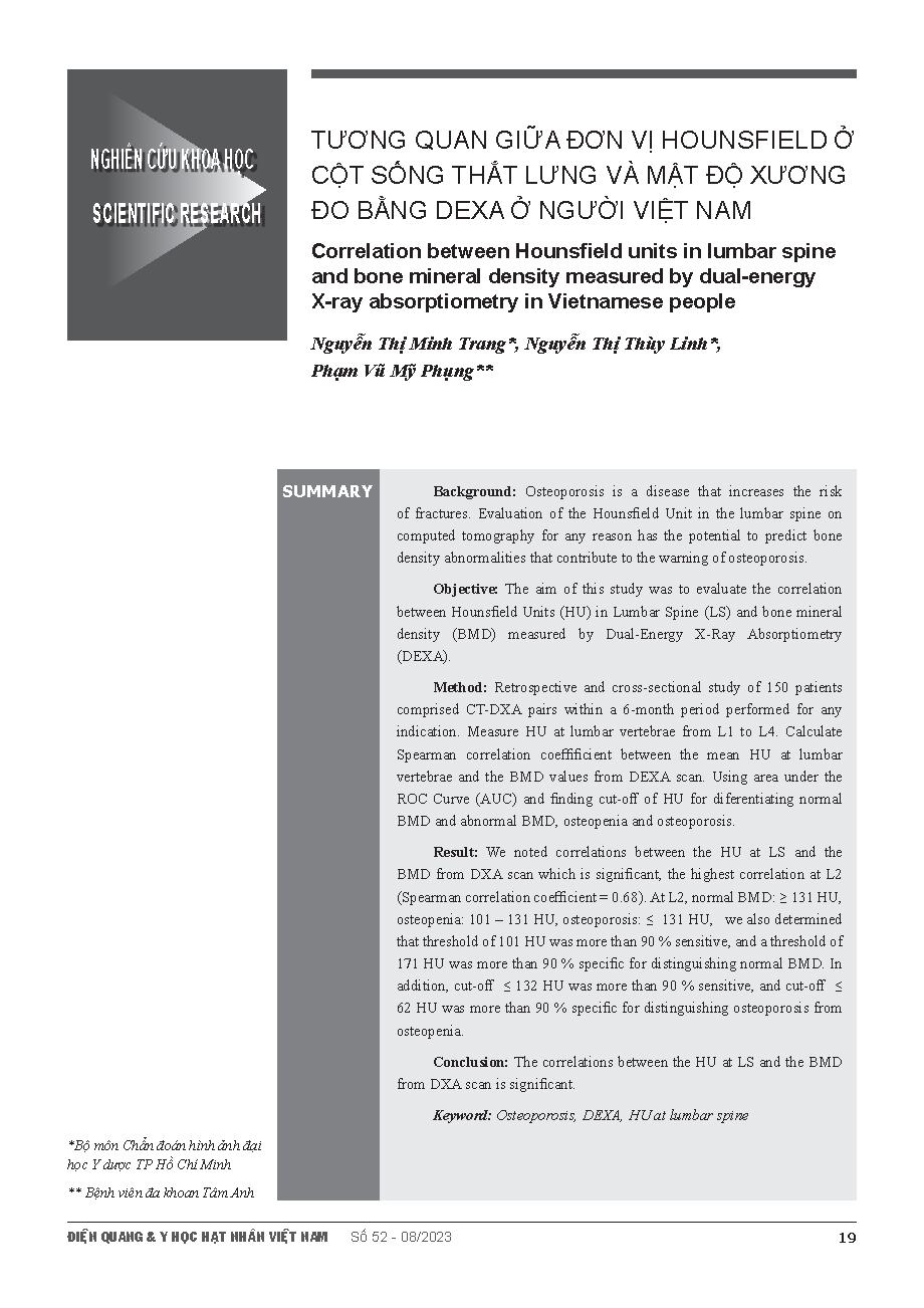 Tương quan giữa đơn vị hounsfield ở cột sống thắt lưng và mật độ xương đo bằng dexa ở người Việt Nam = Correlation between Hounsfield units in lumbar spine and bone mineral density measured by dual-energy X-ray absorptiometry in Vietnamese people