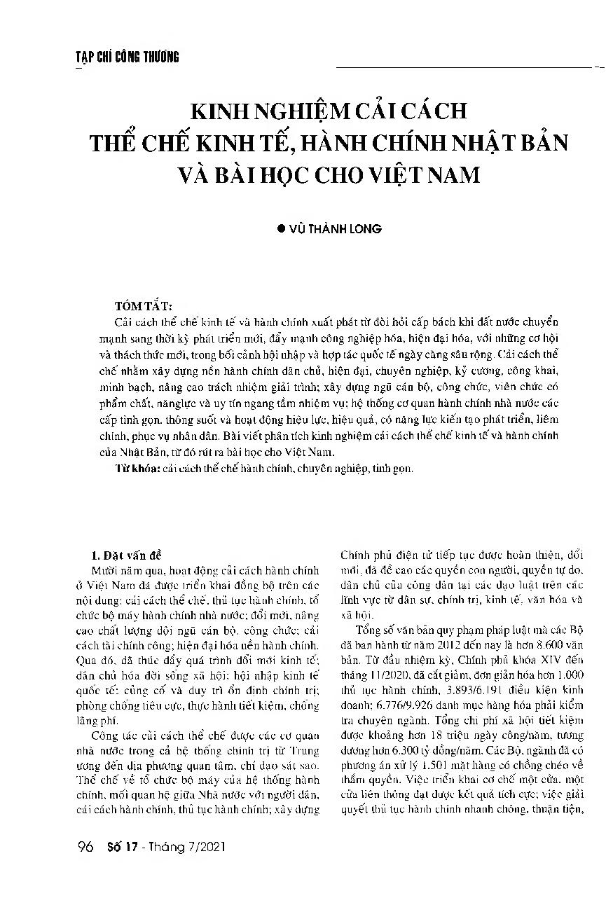Kinh nghiệm cải cách thể chế kinh tế và hành chính Nhật Bản và bài học cho Việt Nam = Japan's experience in reforming its economic and administrative institutions and lesson learned for Vietnam