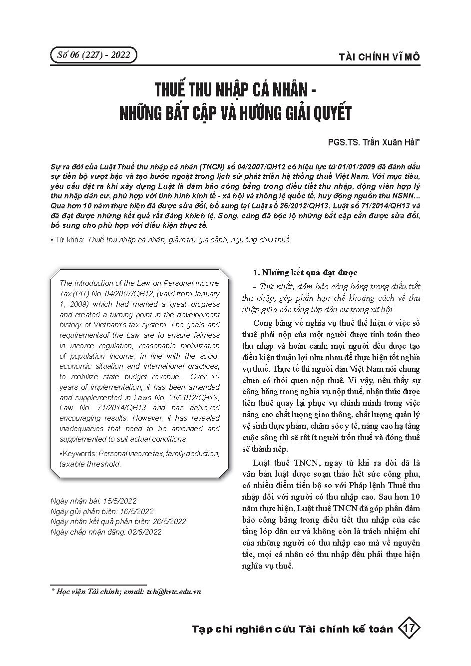 Thuế thu nhập cá nhân - Những bất cập và hướng giải quyết = Personal income tax - Limitations and recommendations