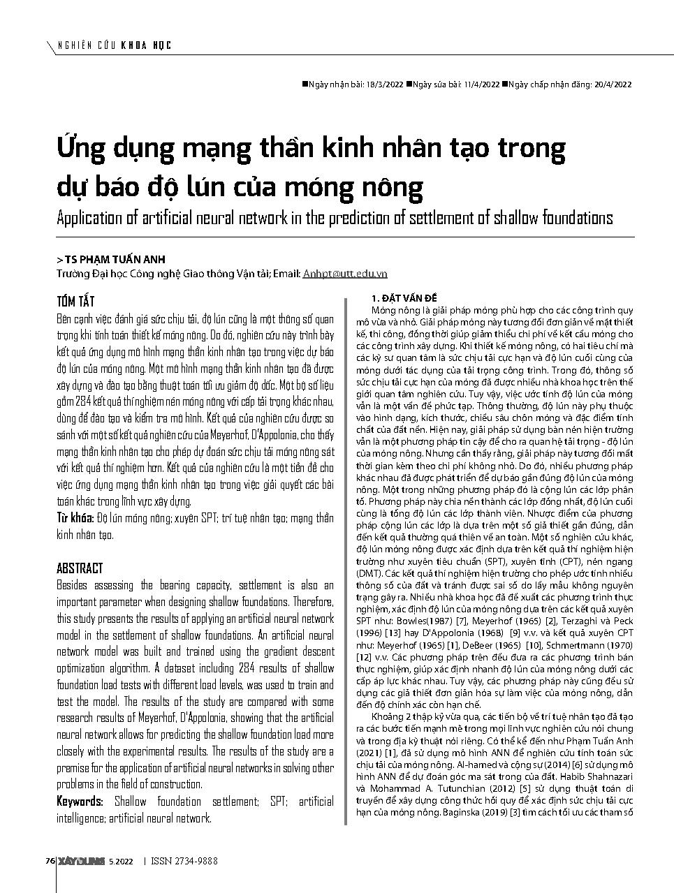 Ứng dụng mạng thần kinh nhân tạo trong dự báo độ lún của móng nông = Application of artificial neural network in the prediction of settlement of shallow foundations