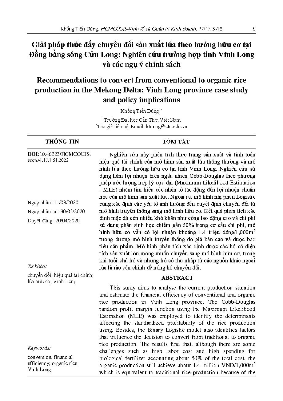 Giải pháp thúc đẩy chuyển đổi sản xuất lúa theo hướng hữu cơ tại Đồng bằng sông Cửu Long: Nghiên cứu trường hợp tỉnh Vĩnh Long và các ngụ ý chính sách = Recommendations to convert from conventional to organic rice production in the Mekong Delta: Vinh Long