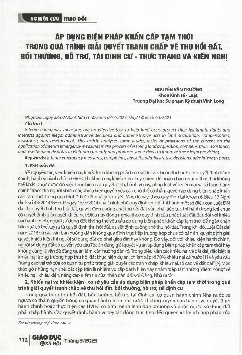 Áp dụng biện pháp khẩn cấp tạm thời trong quá trình giải quyết tranh chấp về thu hối đất, bồi thường, hỗ trợ, tái định CƯ - thực trạng và kiến nghị = Application of interim emergency measures in the process of settling disputes over land acquisition, comp