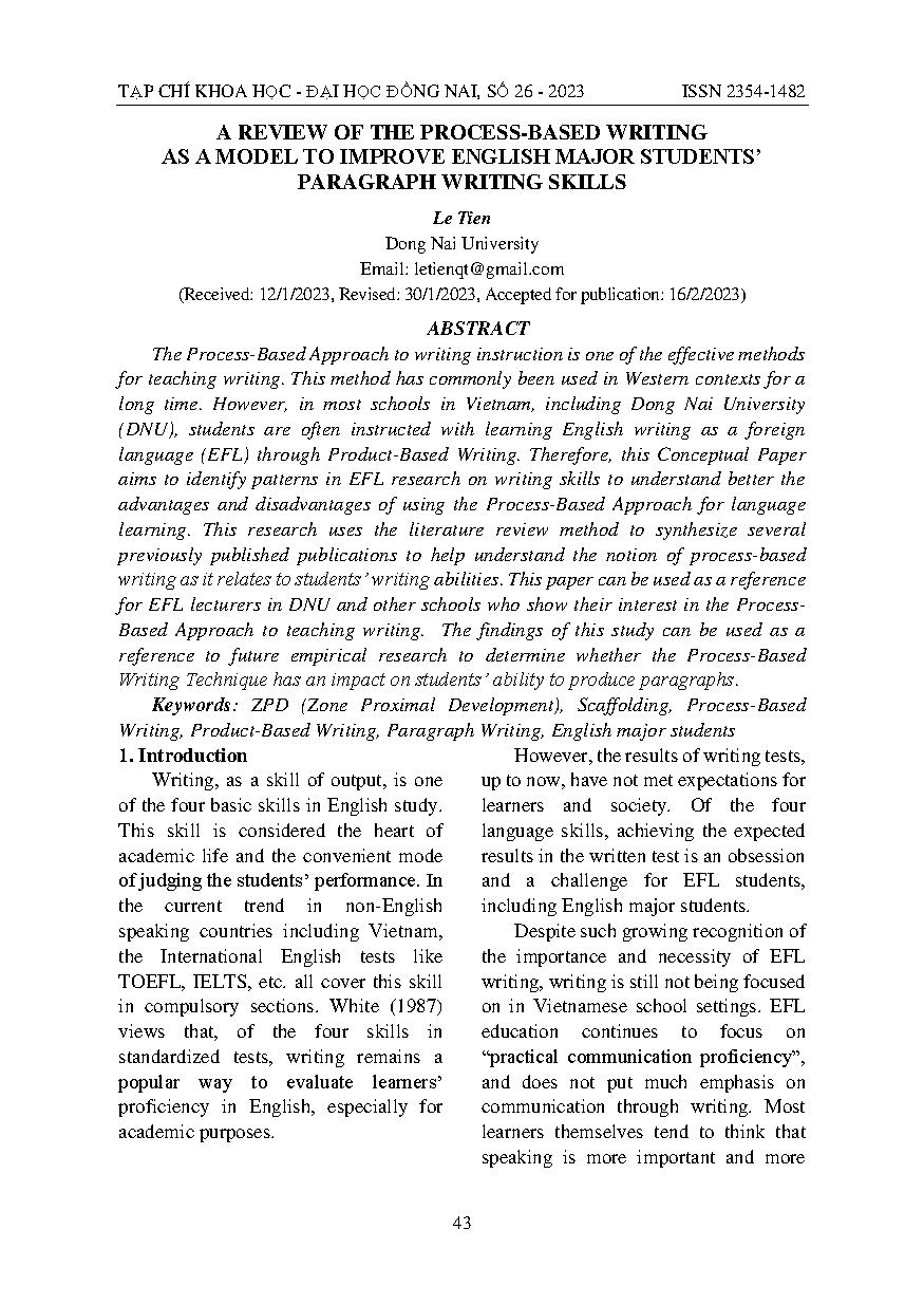 Đánh giá về phương pháp dạy viết dựa trên tiến trình như một mô hình nhằm cải tiến kỹ năng viết đoạn văn của sinh viên chuyên ngành tiếng Anh = A review of the process-based writing as a model to improve english major students' paragraph writing skills