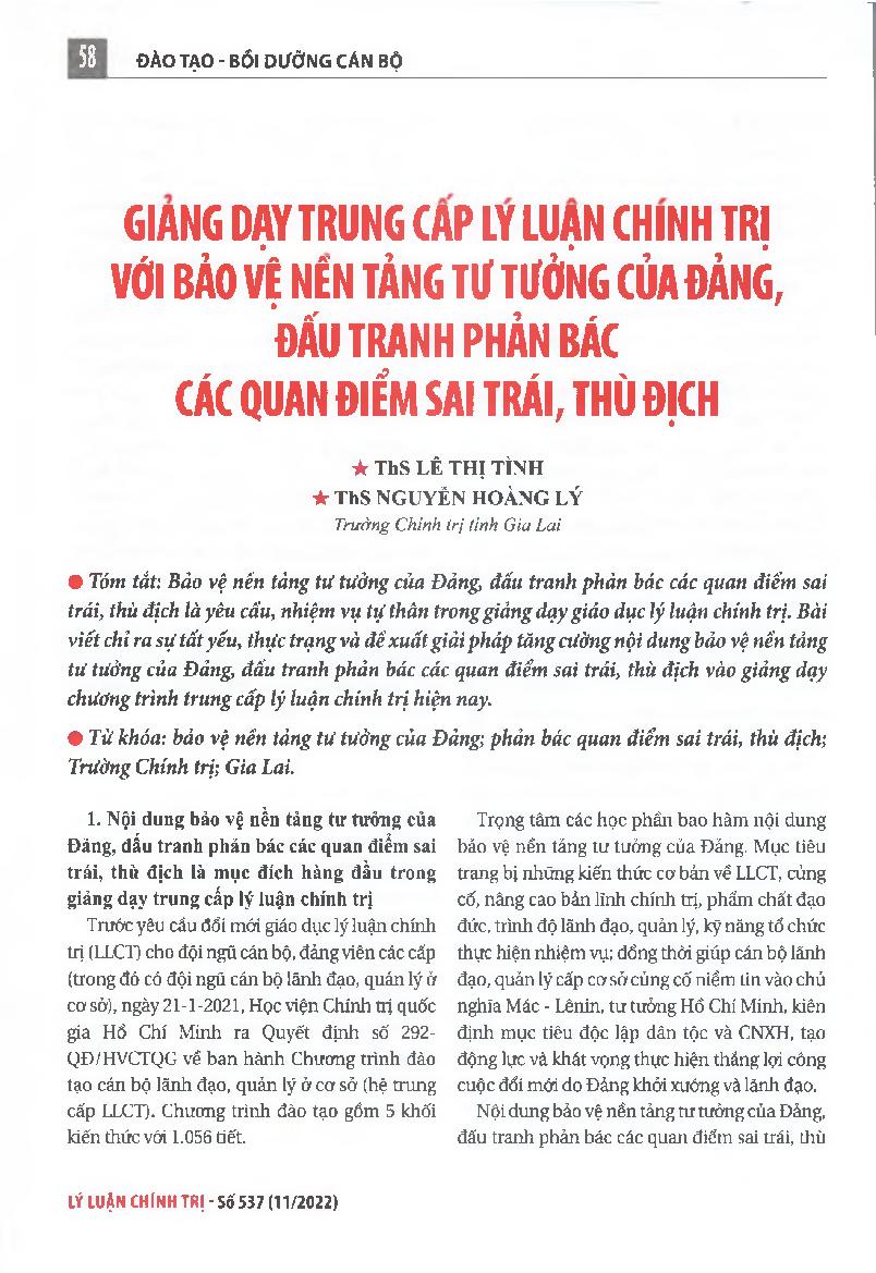 Giảng dạy trung cấp lý luận chính trị với bảo vệ nền tảng tư tưởng của Đảng, đấu tranh phản bác các quan điểm sai trái, thù địch