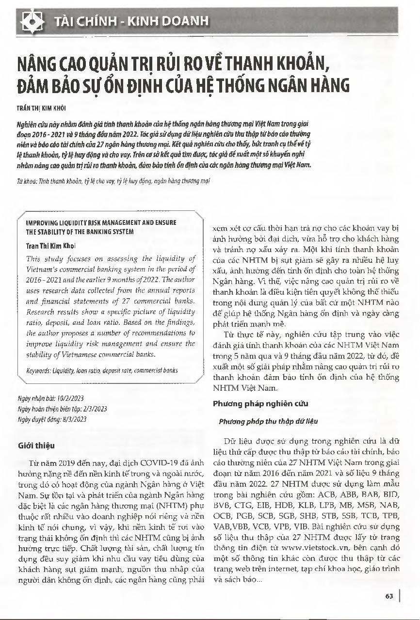 Nâng cao quản trị rủi ro về thanh khoản, đảm bảo sự ổn định của hệ thống ngân hàng = Improving liquidity risk management and ensure the stability of the banking system