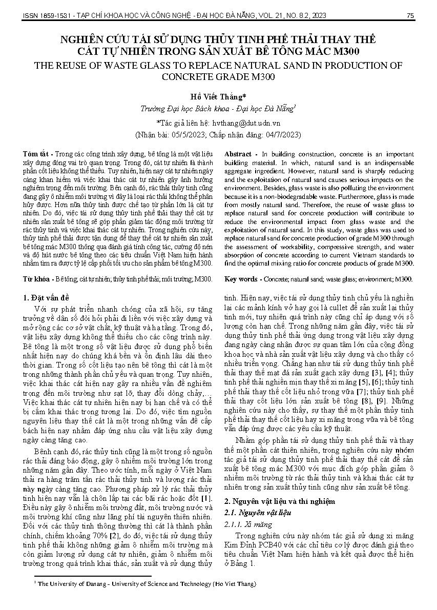 Nghiên cứu tái sử dụng thủy tinh phế thải thay thế cát tự nhiên trong sản xuất bê tông mác m300 = The reuse of waste glass to replace natural sand in production of concrete grade m300