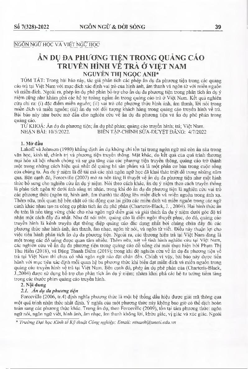 Ẩn dụ đa phương tiện trong quảng cáo truyền hình về trà ở Việt Nam = Mulimodal metaphors in tea TV commercials in Vietnam