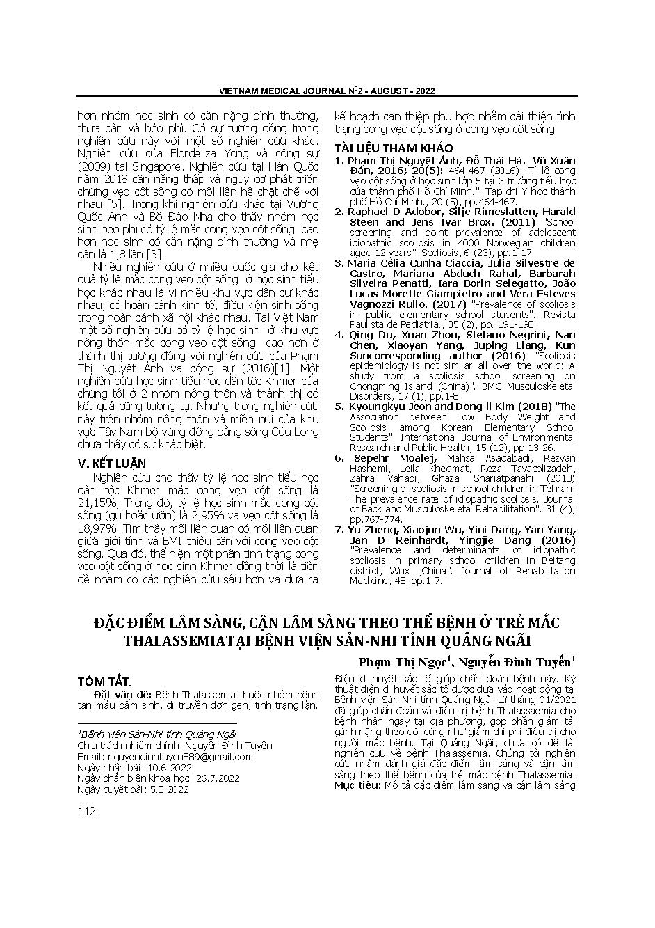 Đặc điểm lâm sàng, cận lâm sàng theo thể bệnh ở trẻ mắc thalassemiatại Bệnh viện Sản-Nhi tỉnh Quảng Ngãi = Clinical and subclinical characteristics in children with thalassemia at Quang ngai hospital for women and children
