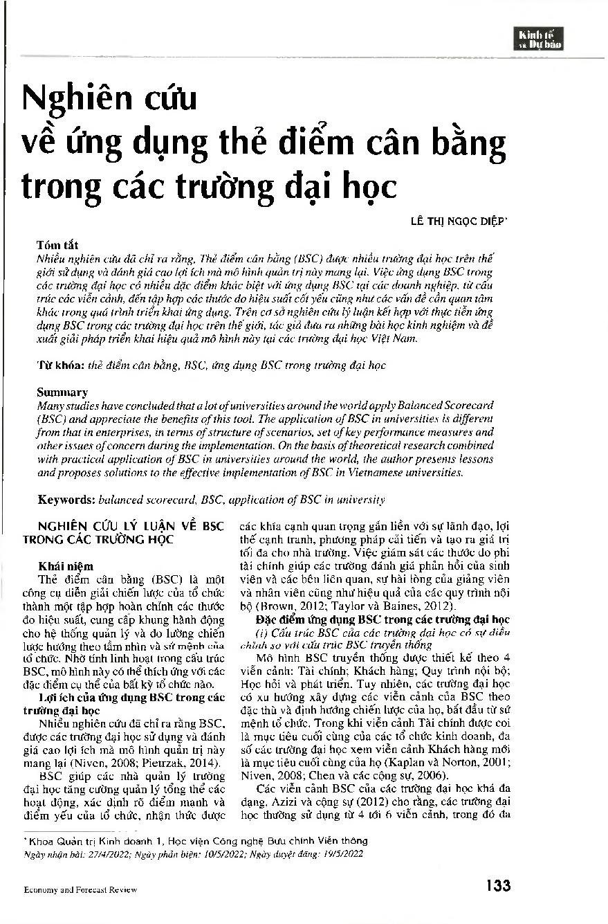 Nghiên cứu về ứng dụng thẻ điểm cân bằng trong các trường đại học = A study on the application of the balanced scorecard in higher education