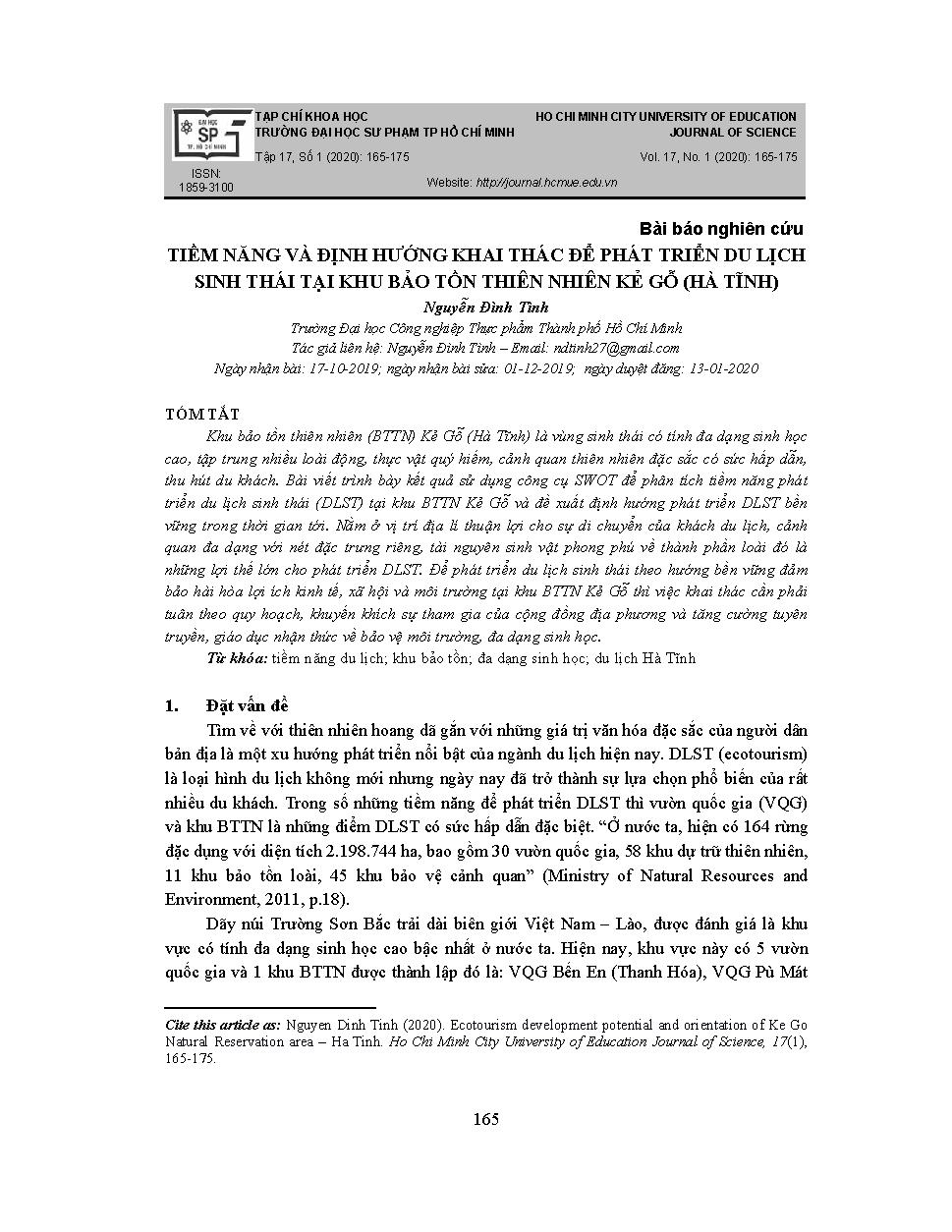 Tiềm năng và định hướng khai thác để phát triển du lịch sinh thái tại khu bảo tồn thiên nhiên Kẻ Gỗ (Hà Tĩnh). = Ecotourism development potential and orientation of Ke Go natural reservation area – Ha Tinh