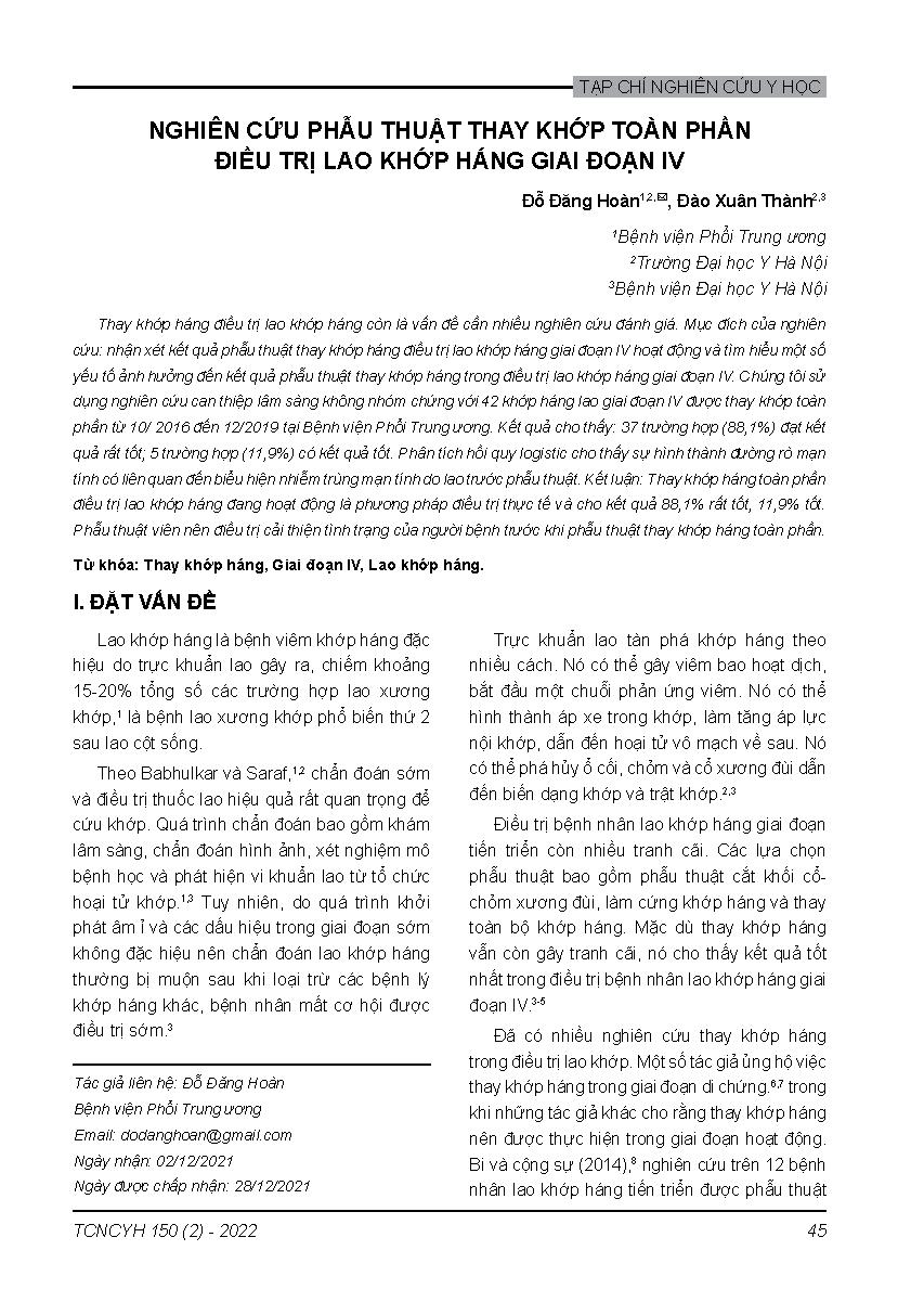 Nghiên cứu phẫu thuật thay khớp toàn phần điều trị lao khớp háng giai đoạn IV