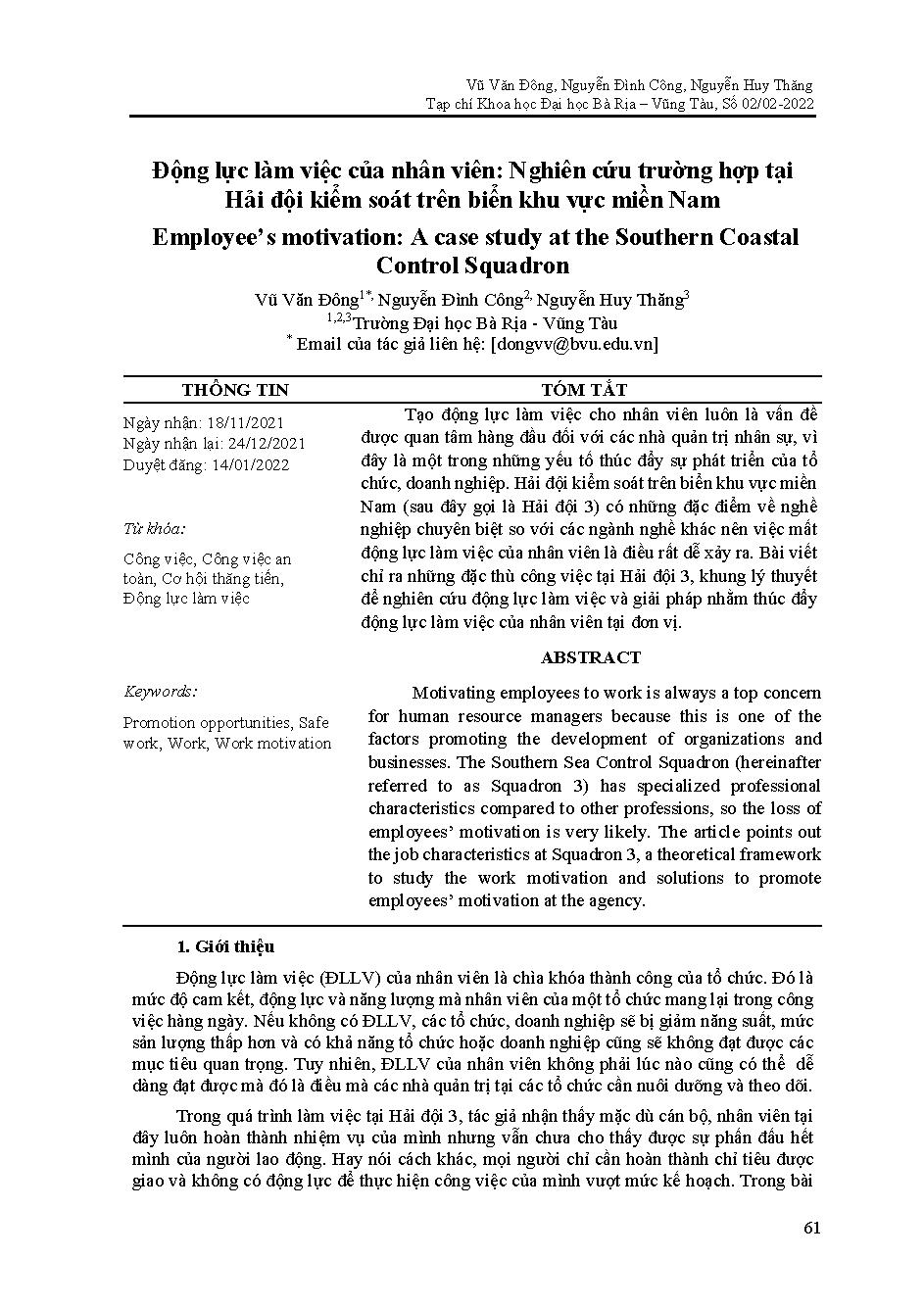 Động lực làm việc của nhân viên: Nghiên cứu trường hợp tại Hải đội kiểm soát trên biển khu vực miền Nam = Employee’s motivation: A case study at the Southern Coastal Control Squadron