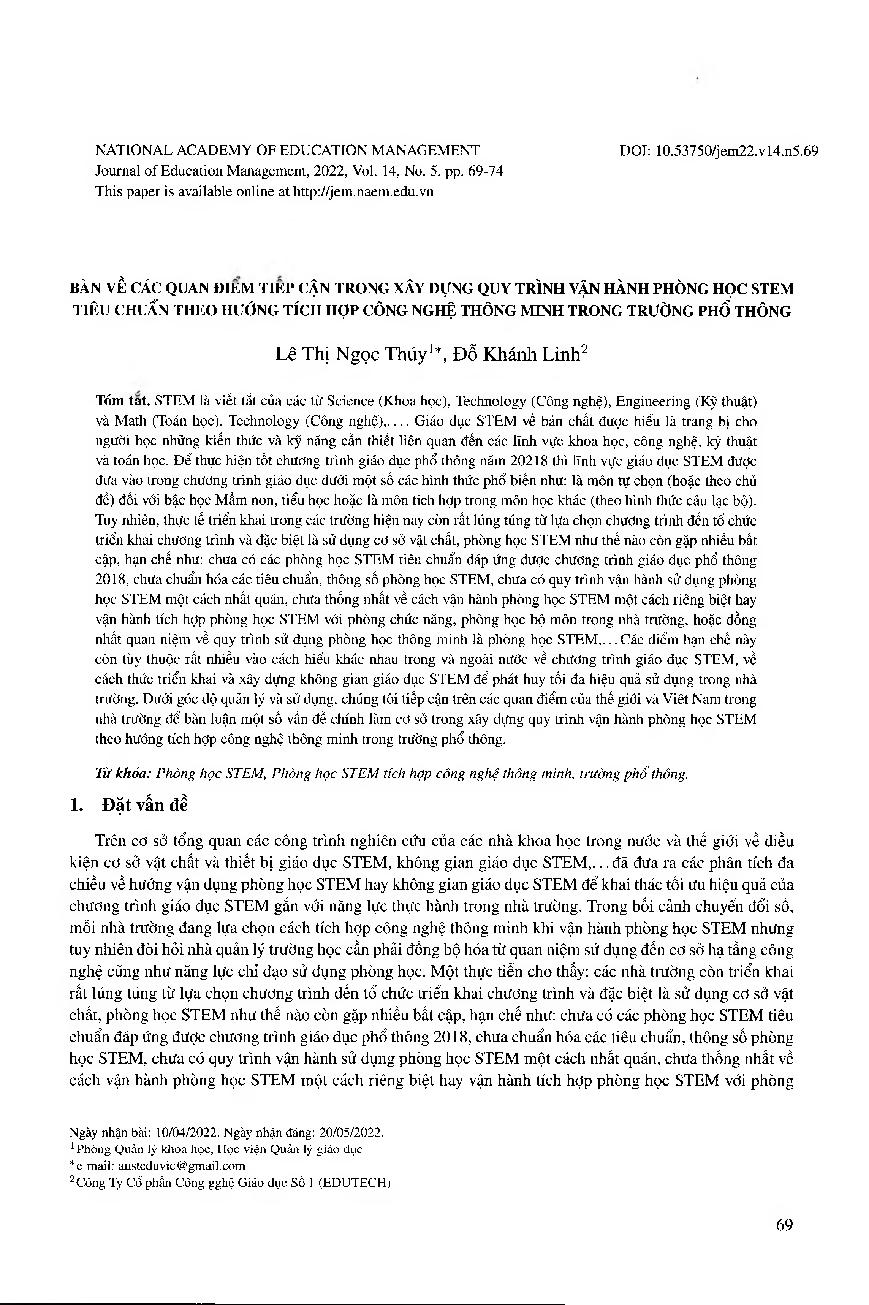 Bàn về các quan diem tiep cận trong xây dựng quy trình vận hành phòng học stem tiêu chuẩn theo hướng tích hợp công nghệ thông minh trong trường phổ thông = Discussed viewpoints in setting standards for operating STEM in the integrating smart technology in