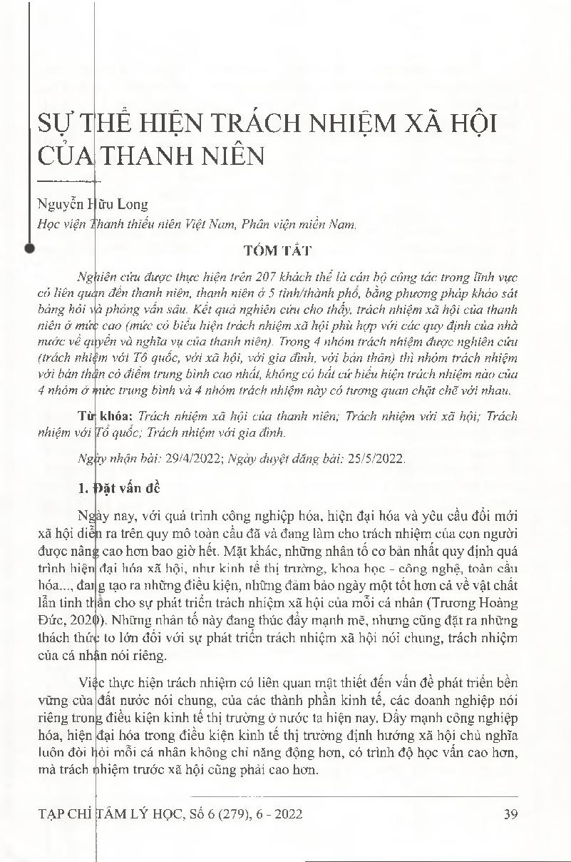 Sự thể hiện trách nhiệm xã hội của thanh niên = Social responsibility in young people