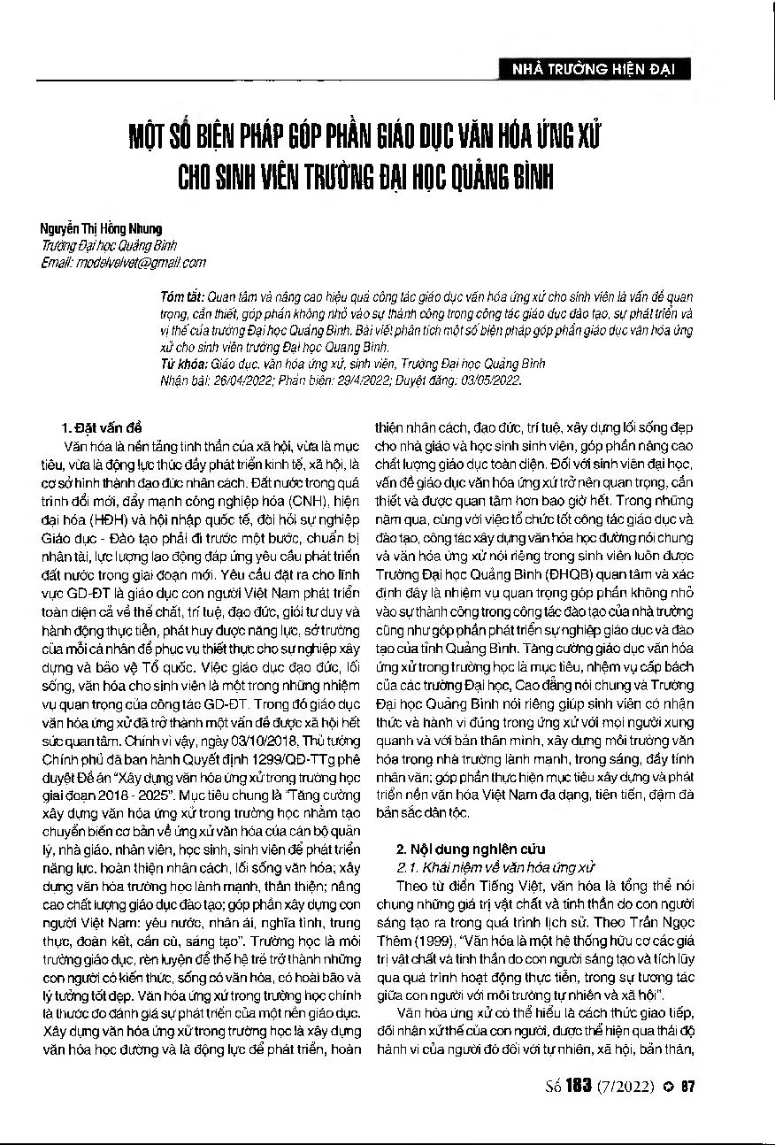 Một số biện pháp góp phần giáo dục văn hóa ứng xử cho sinh viên trường Đại học Quảng Bình = Some measures contributing to the education of cultural behavior for the students of Quang Binh University