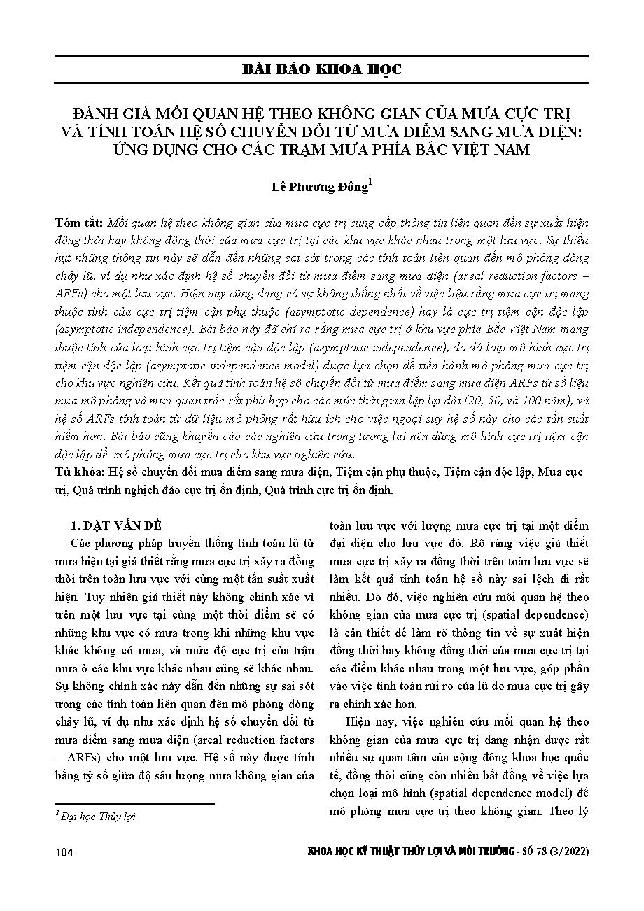 Đánh giá mối quan hệ theo không gian của mưa cực trị và tính toán hệ số chuyển đổi từ mưa điểm sang mưa diện: Ứng dụng cho các trạm mưa phía Bắc Việt Nam = Dependence properties of spatial rainfall extremes and areal reduction factors: an application for