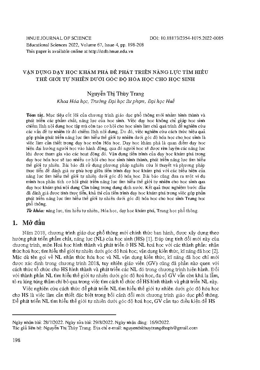 Vận dụng dạy học khám phá để phát triển năng lực tìm hiểu thế giới tự nhiên dưới góc độ hóa học cho học sinh = Applying inquiry-based learning to develop students&; 39; competence to inquiry about the natural world under chemistry