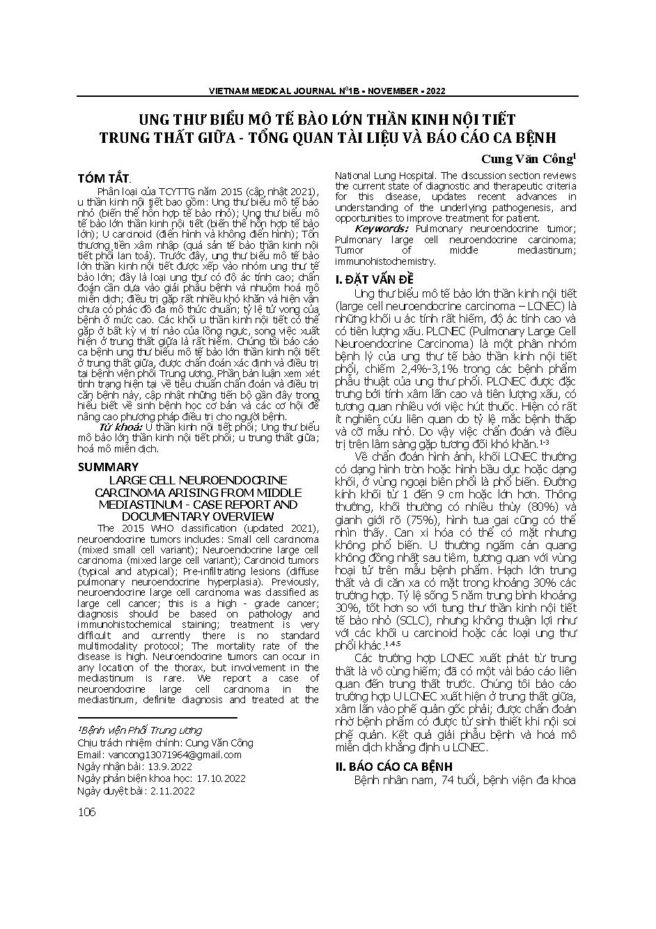 Ung thư biểu mô tế bào lớn thần kinh nội tiết trung thất giữa - Tổng quan tài liệu và báo cáo ca bệnh = Large cell neuroendocrine carcinoma arising from middle mediastinum - Case report and documentary overview