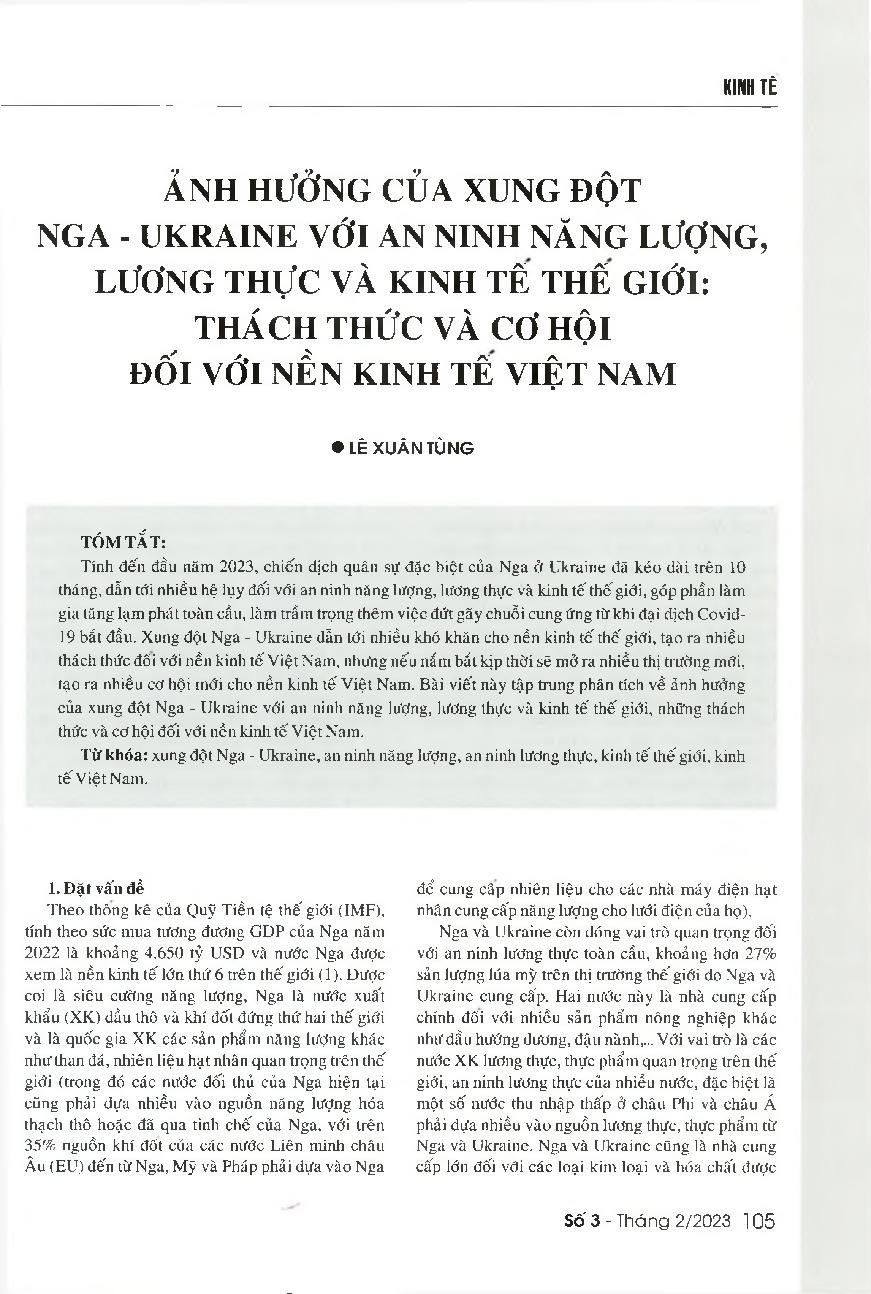 Ảnh hưởng của xung đột Nga - Ukraine với an ninh năng lượng, lương thực và kinh tế thế giới: Thách thức và cơ hội đối với nền kinh tế Việt Nam = Impacts of the Russia-Ukraine conflict on the energy, food markets and the world economy: Challenges and oppor